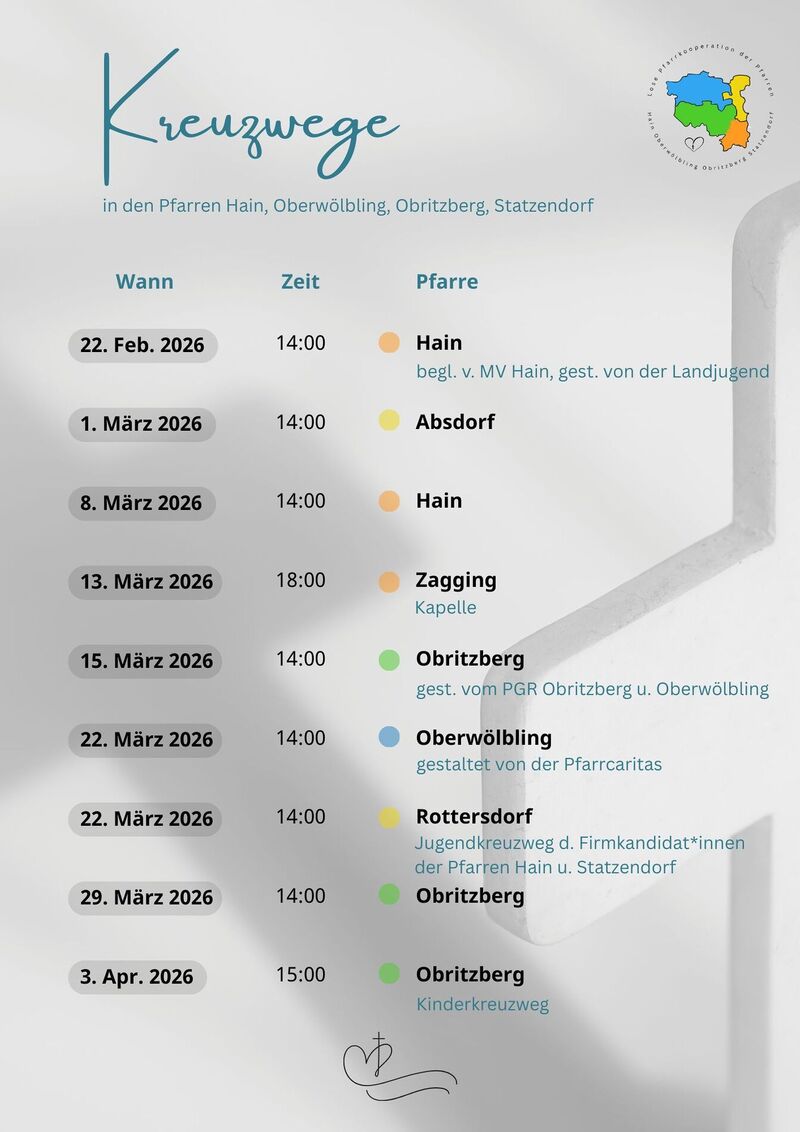 Der nächste Kreuzweg in der Pfarrkirche Hain findet am Sonntag, den 8. März statt. Am Freitag, den 13. März ist der Kreuzweg in der Kapelle in Zagging.